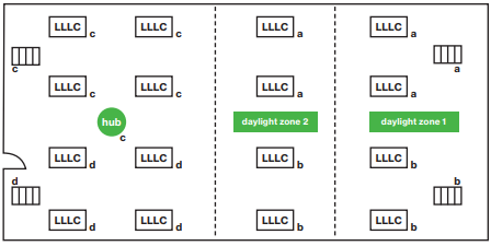 This open office design uses a LLLC system with integrated sensors and a connected gateway. The drawing has a legend to easily identify system components. A detailed matrix with narrative references the drawing to communicate complete design intent.